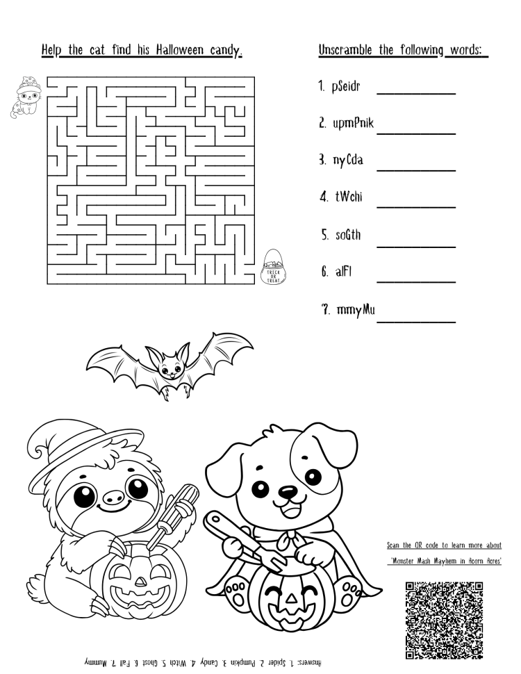 “Monster Mash Mayhem in Acorn Acres” Halloween Coloring and Activity Sheet. – Click here for even more spooky fun!
